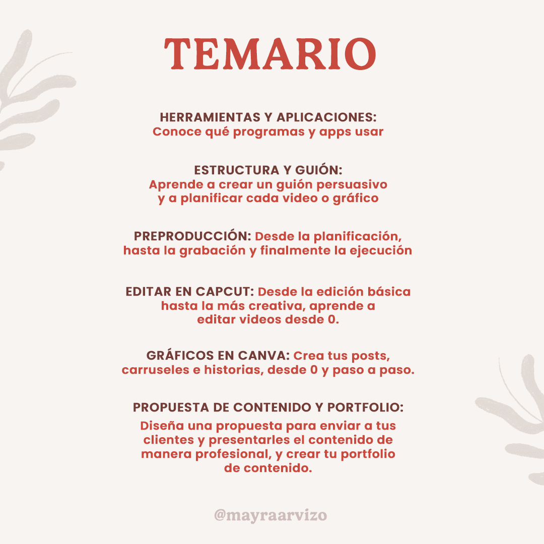 ❌ Este curso no incluye creación de contenido: edición de video y gráficos, puedes adquirir la parte 2 aquí. ¿Tienes dudas antes de comprar? Escríbeme en mis redes sociales @mayraarvizo.co @mayraarvizo